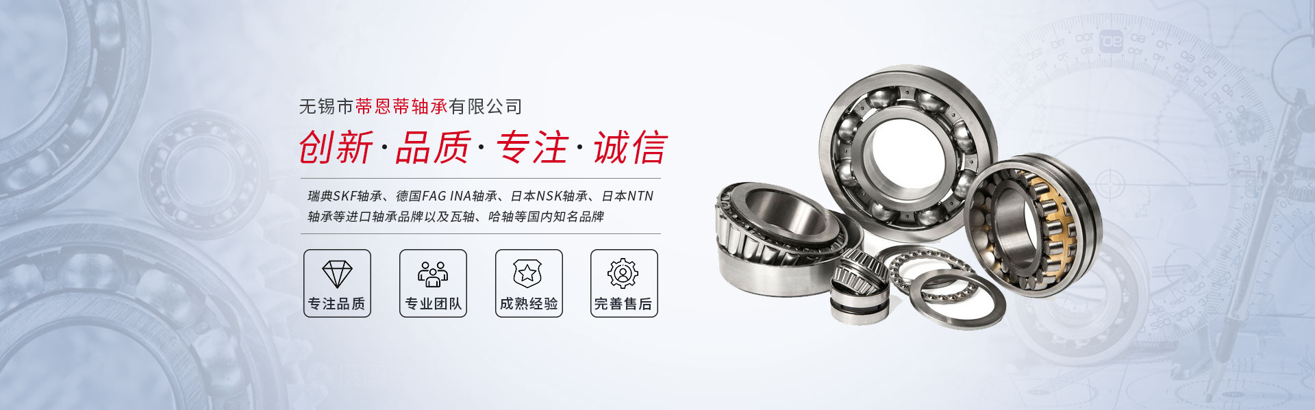 無錫市蒂恩蒂軸承有限公司是一家經銷國產、進口軸承品牌代理的專業公司,公司自成立以來一直以市場為導向,以真誠服務為宗旨,以質量為生命,服務與廣大用戶,竭誠為客戶提供優質的產品和全面的的服務。 主要經營品牌有:瑞典SKF軸承、德國FAG INA軸承、日本NSK軸承、日本NTN軸承等進口軸承品牌以及瓦軸、哈軸等國內知名品牌,產品供應類型包括:深溝球軸承、角接觸球軸承、調心球軸承、圓柱滾子軸承、調心滾子軸承、圓錐滾子軸承、推力球軸承、球面滾子軸承、滾針軸承、直線軸承等各種優質軸承...